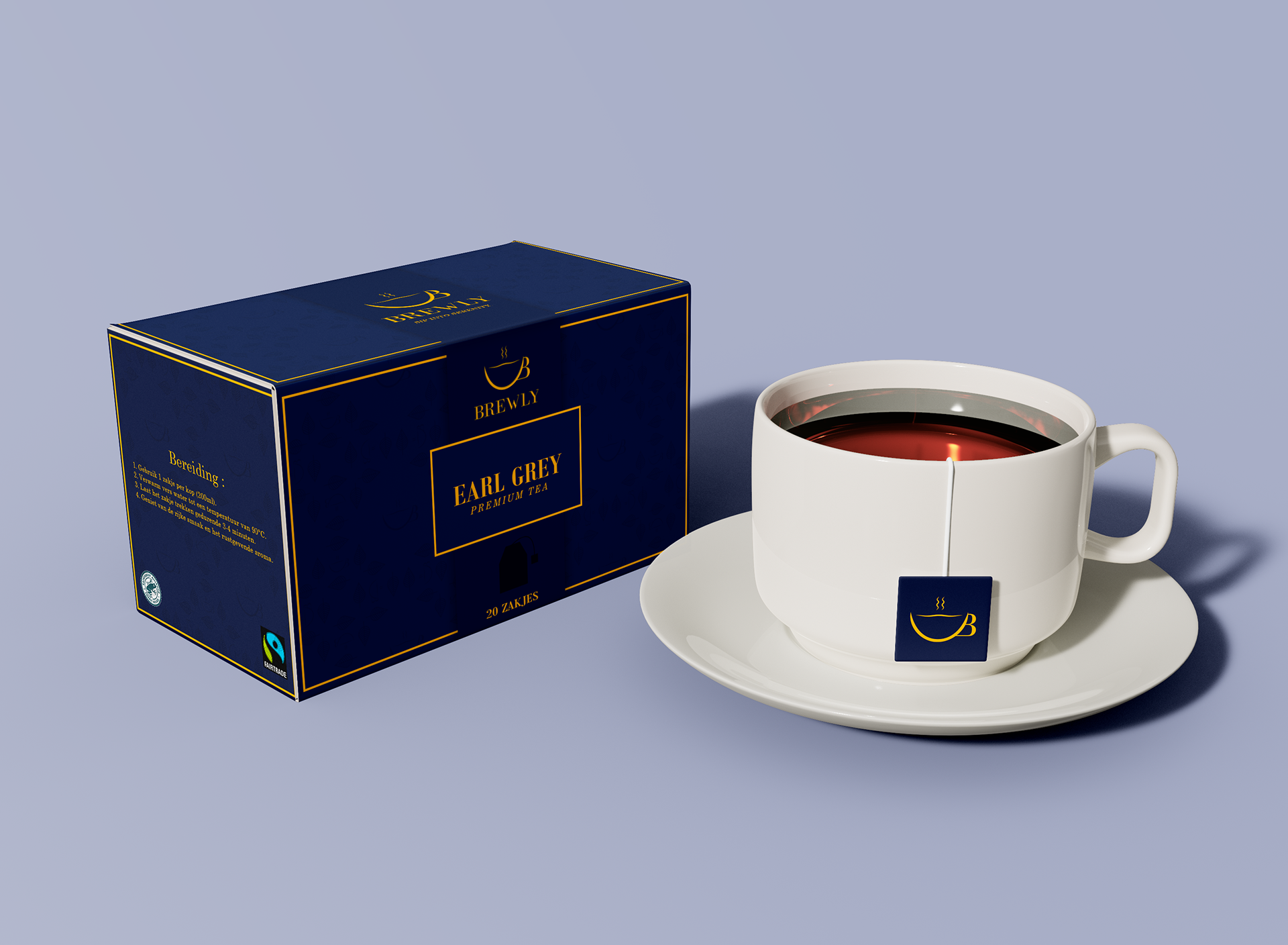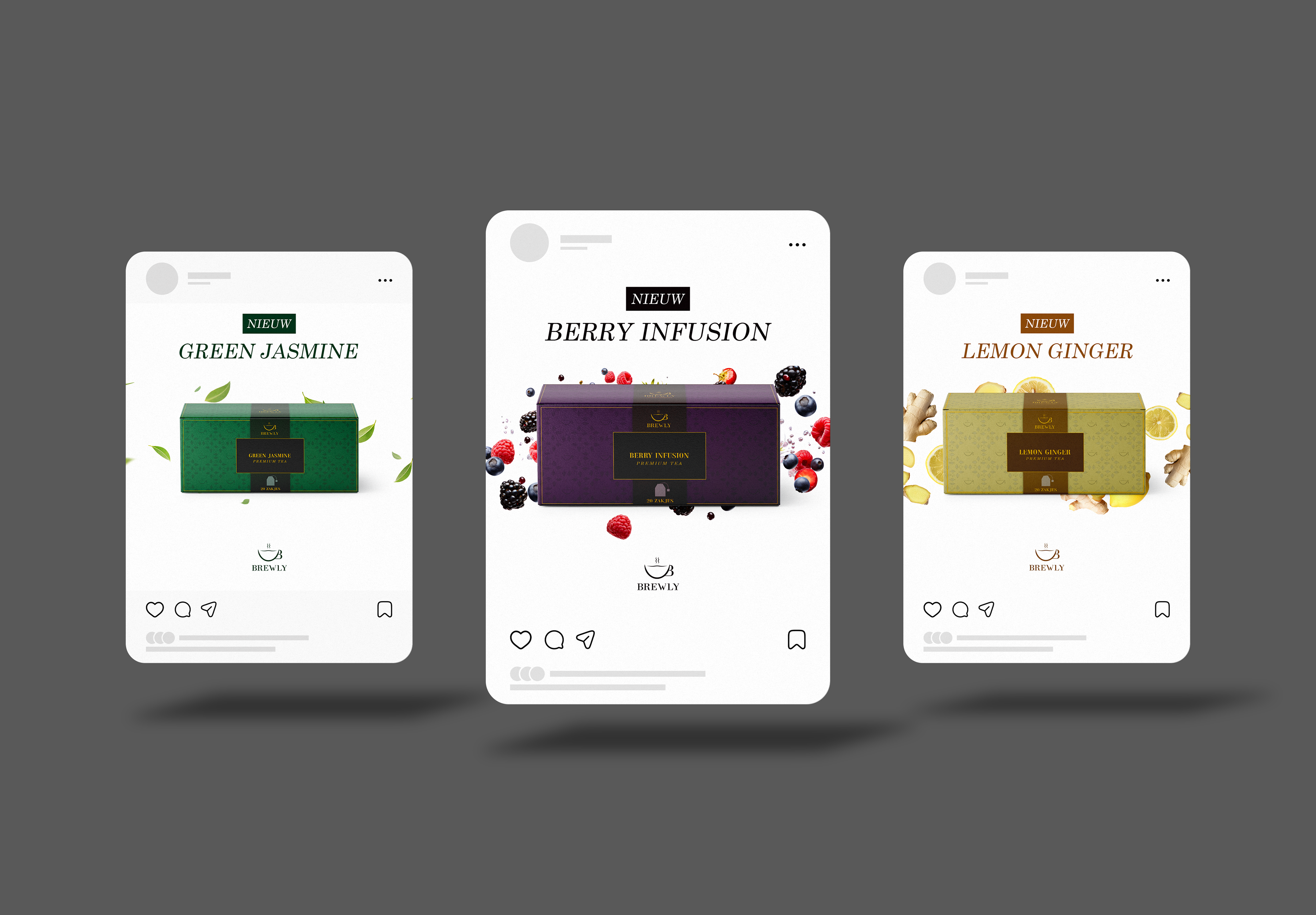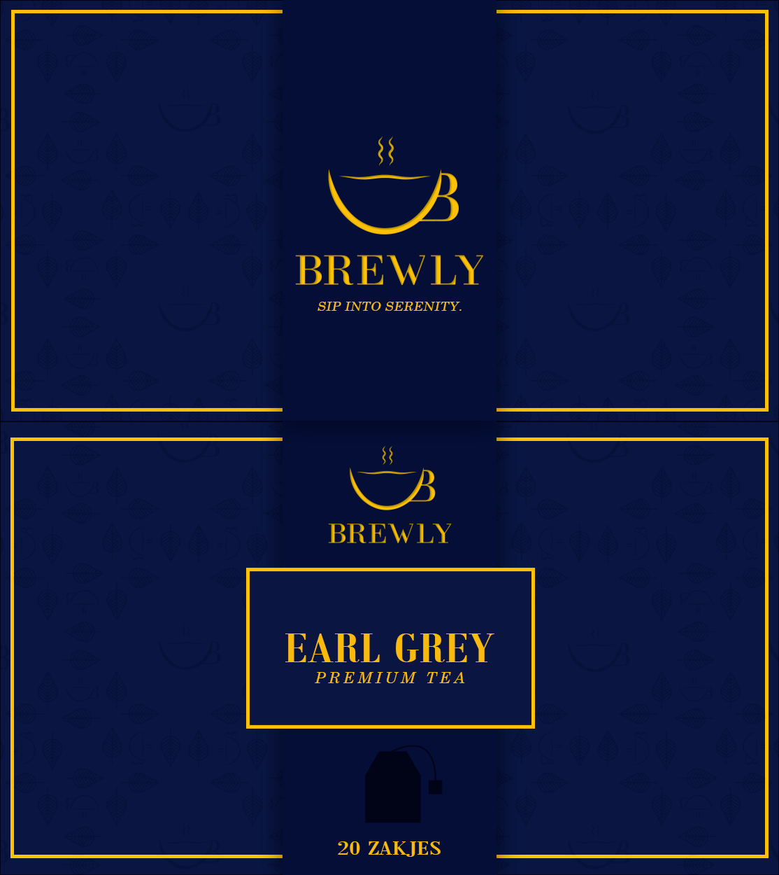 Brewly is een fictief theemerk dat ik heb ontworpen als branding- en designoefening. Het merk combineert minimalistische vormen met een luxe uitstraling en een gevoel van rust. Voor dit project ontwierp ik de verpakkingen, patronen en social media visuals.